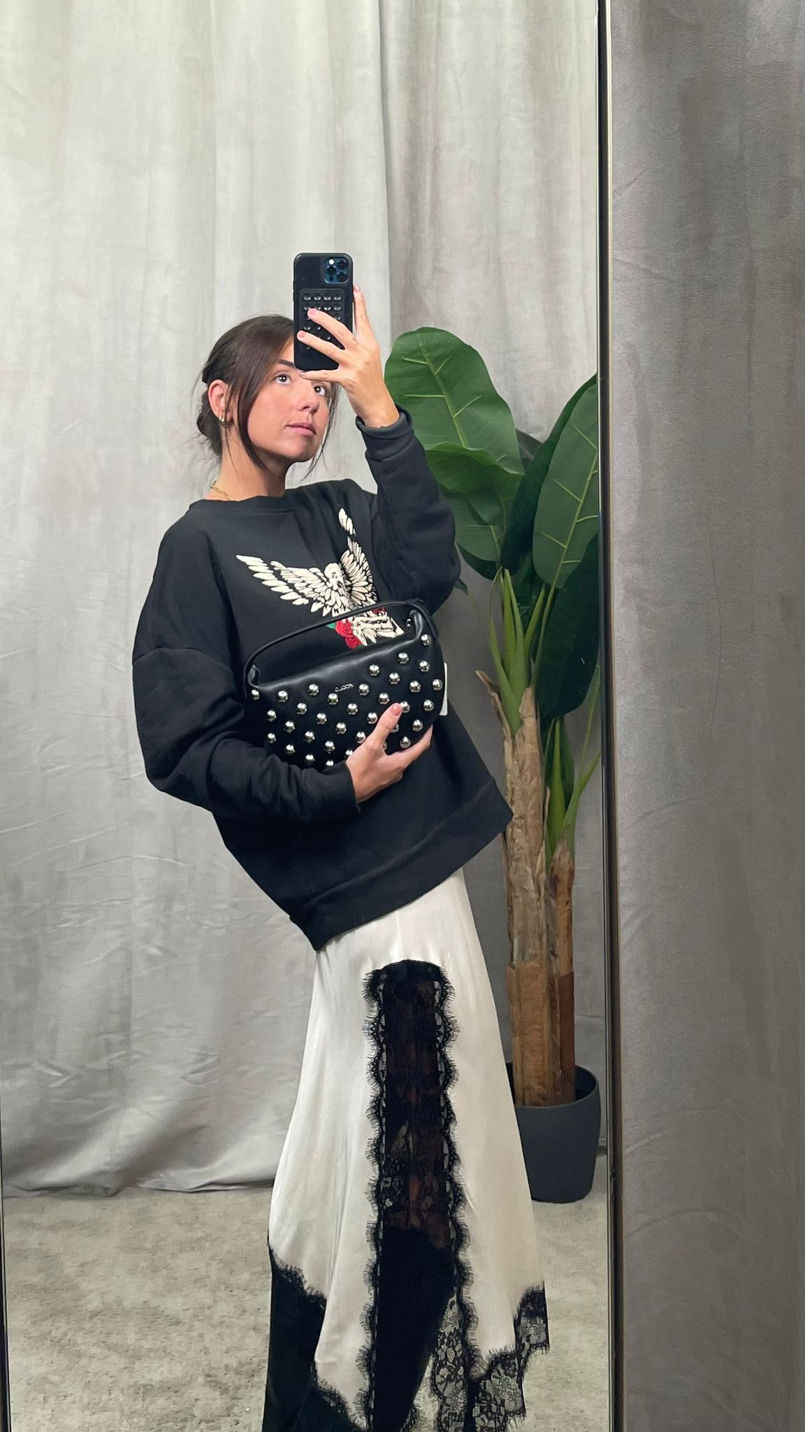 Borsa Croissant a mano in ecopelle con borchie in metallo lucido applicate. Chiusura con cerniera. Dettaglio logo Vicolo laserato. Finiture anticate color argento. Tasca interna con cerniera e taschina piatta.