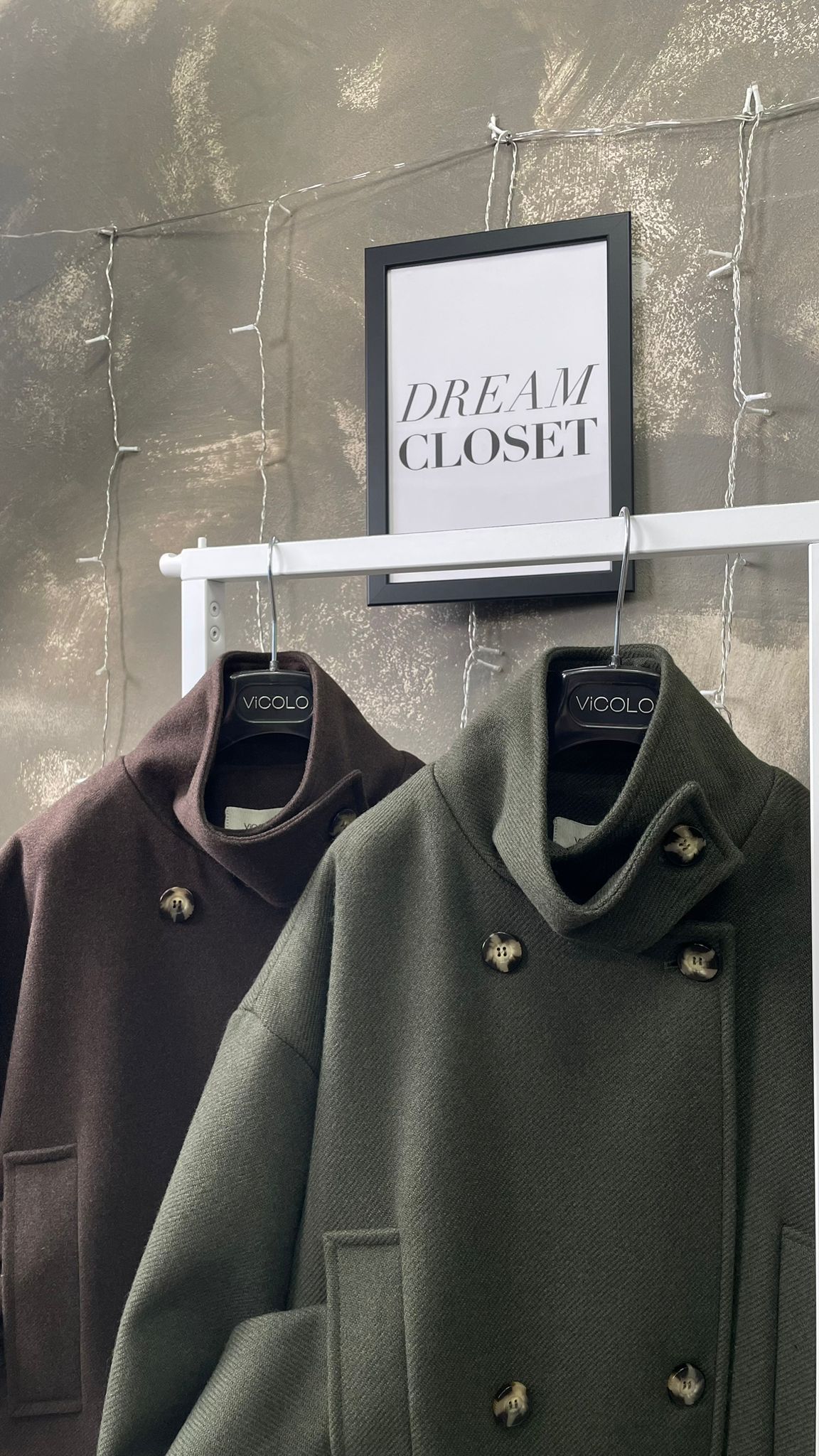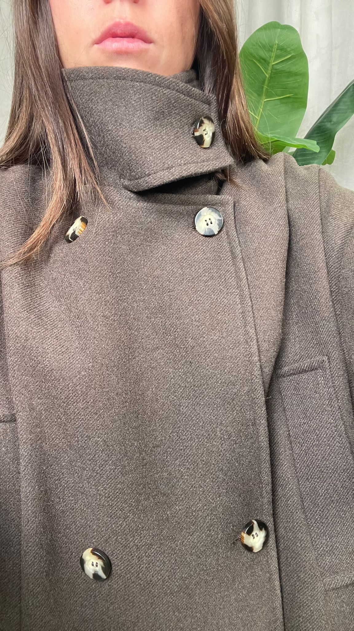 Cappotto Vicolo con collo alto e chiusura con bottoni frontali. Taglio Oversize con tasche sia frontali che laterali. Veste Oversize