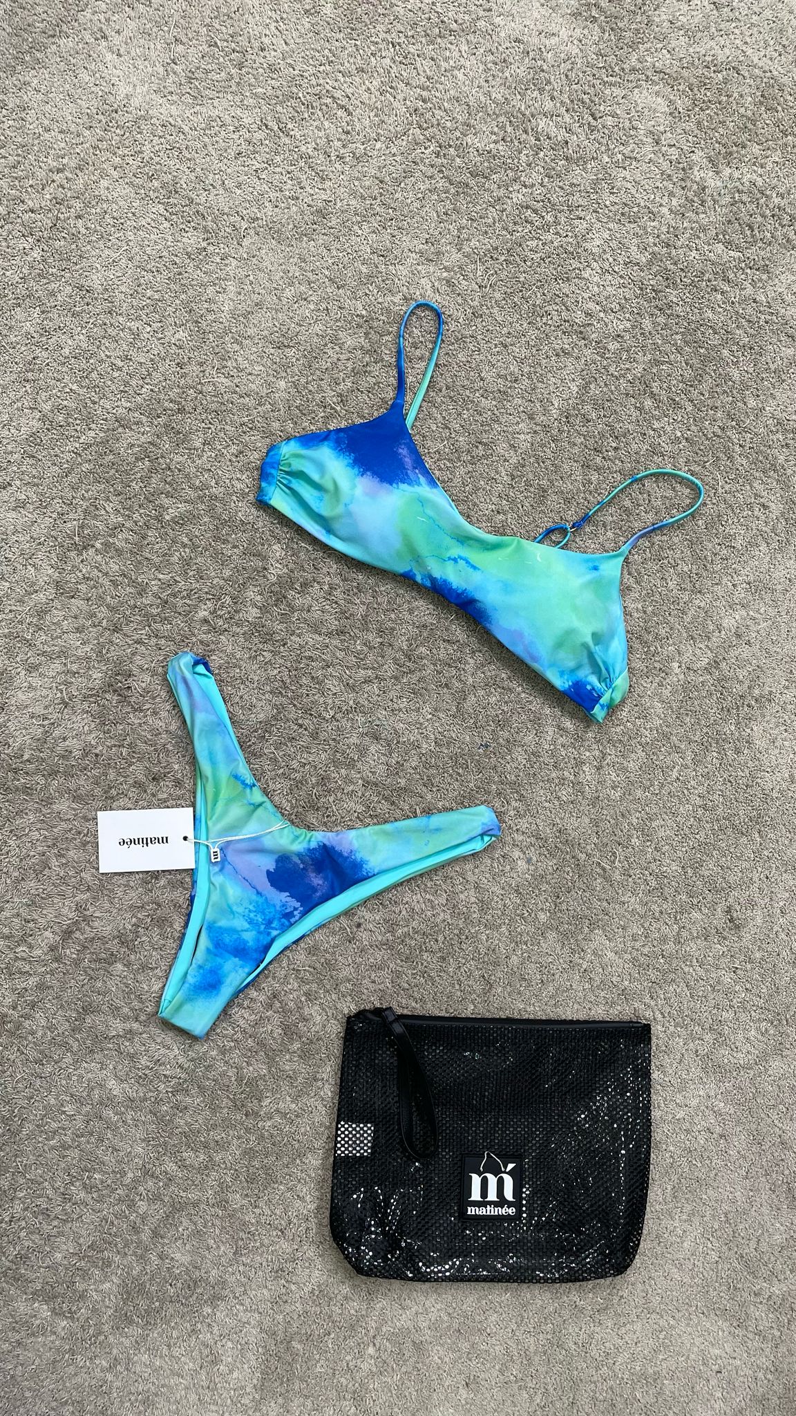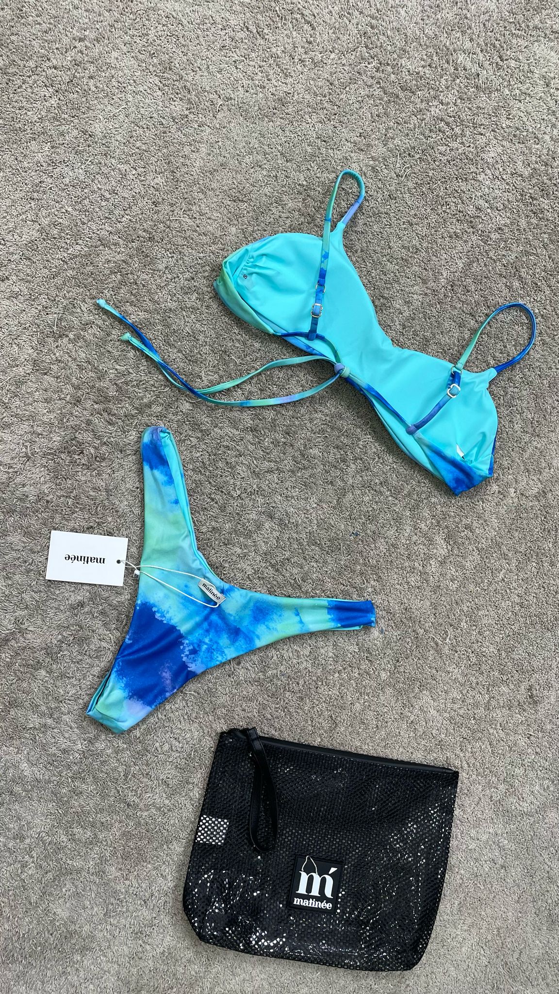 Dora è il bikini che combina un top a fascia con imbottitura estraibile e bretelle regolabili, e uno slip a brasiliana con taglio a V. La chiusura del top è regolabile, grazie ai laccetti annodabili, per garantirti il massimo della personalizzazione. In fantasia loose di colore azzurro, per look freschi e allegri. Realizzato in microfibra, un tessuto leggero e resistente, perfetto per costumi da bagno confortevoli.