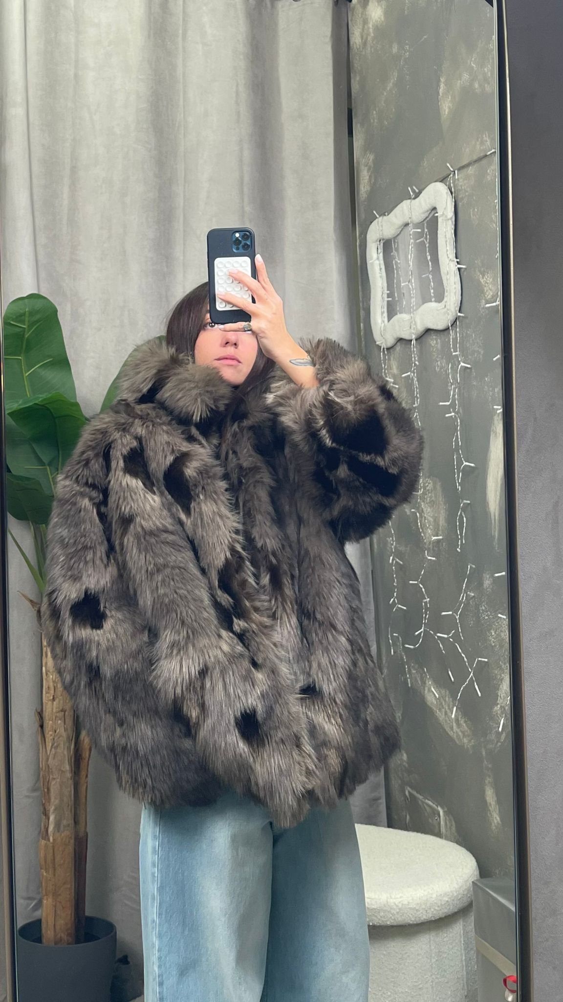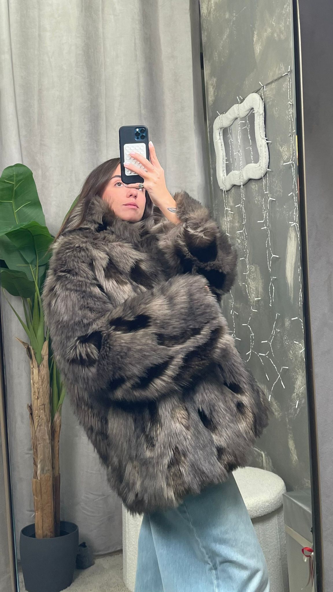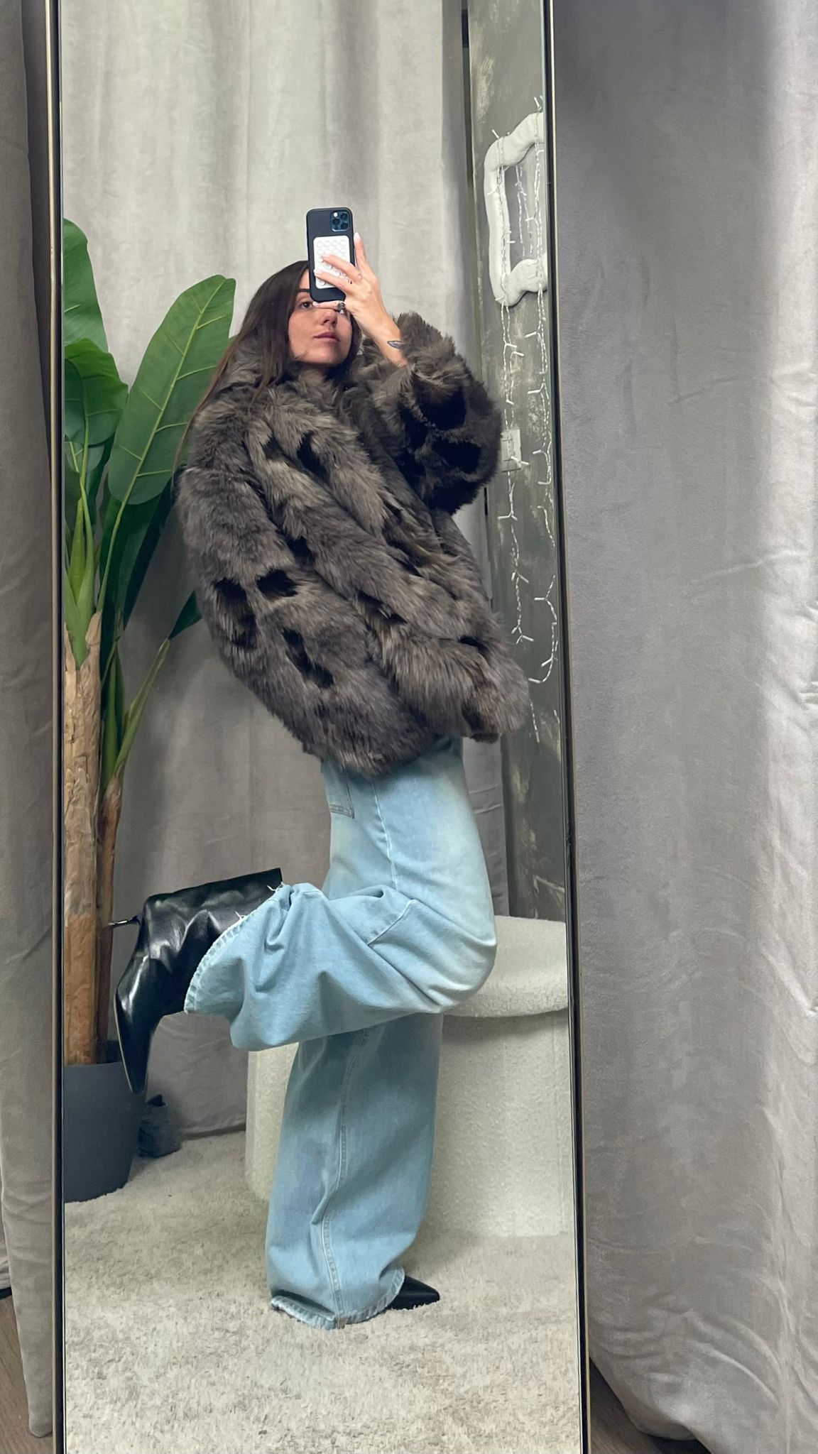 Eco-pelliccia HaveOne. Chiusura con ganecetti nascosti. Collo alto, tasche a filo. Taglio Oversize