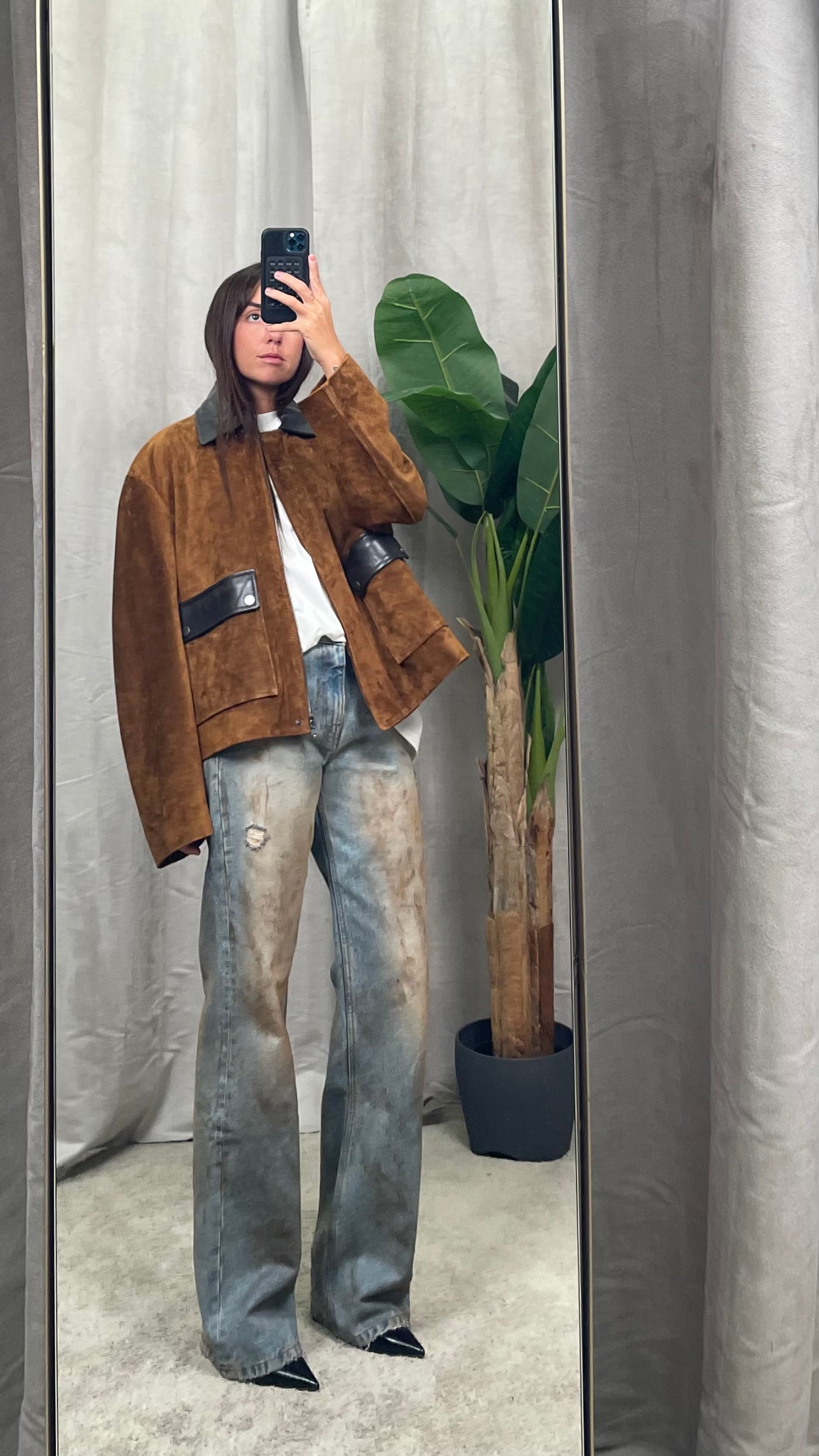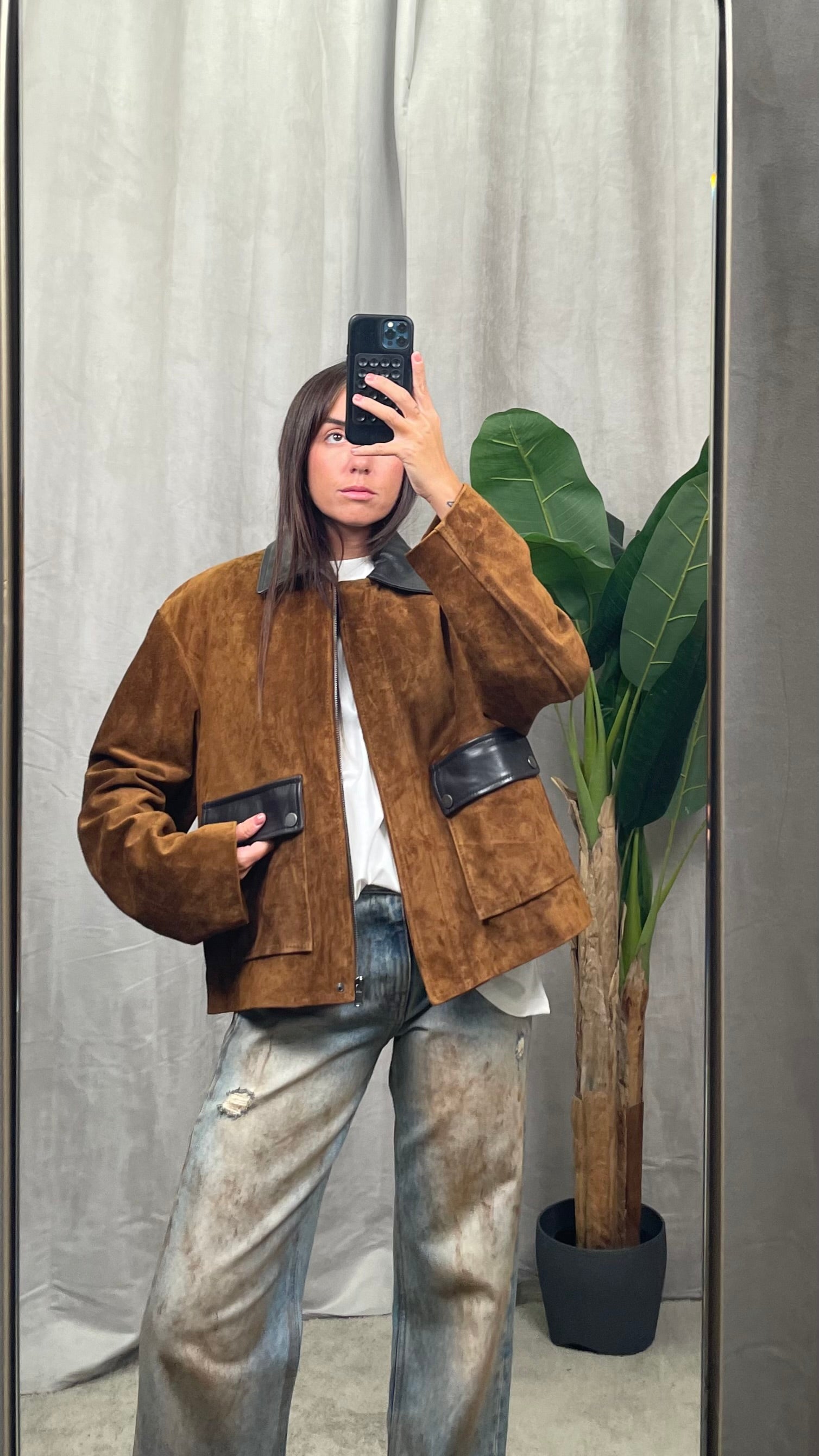 Giacca corta monopetto maniche lunghe con colletto in vera pelle scamosciata. Tasche frontali applicate con pattine e bottoni. Chiusura con zip nascosta. Collo e pattine tasche in pelle liscia.