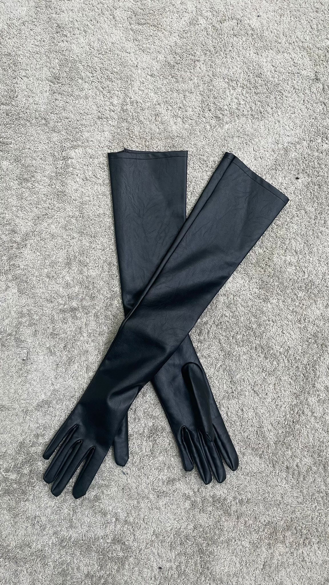 Guanti lunghi in ecopelle nera dal design elegante e moderno. La lunghezza sopra il gomito li rende perfetti per aggiungere un tocco sofisticato a look serali, abiti senza maniche o outfit dal mood rétro-glam. Morbidi, aderenti e confortevoli, completano qualsiasi ensemble con carattere e stile.