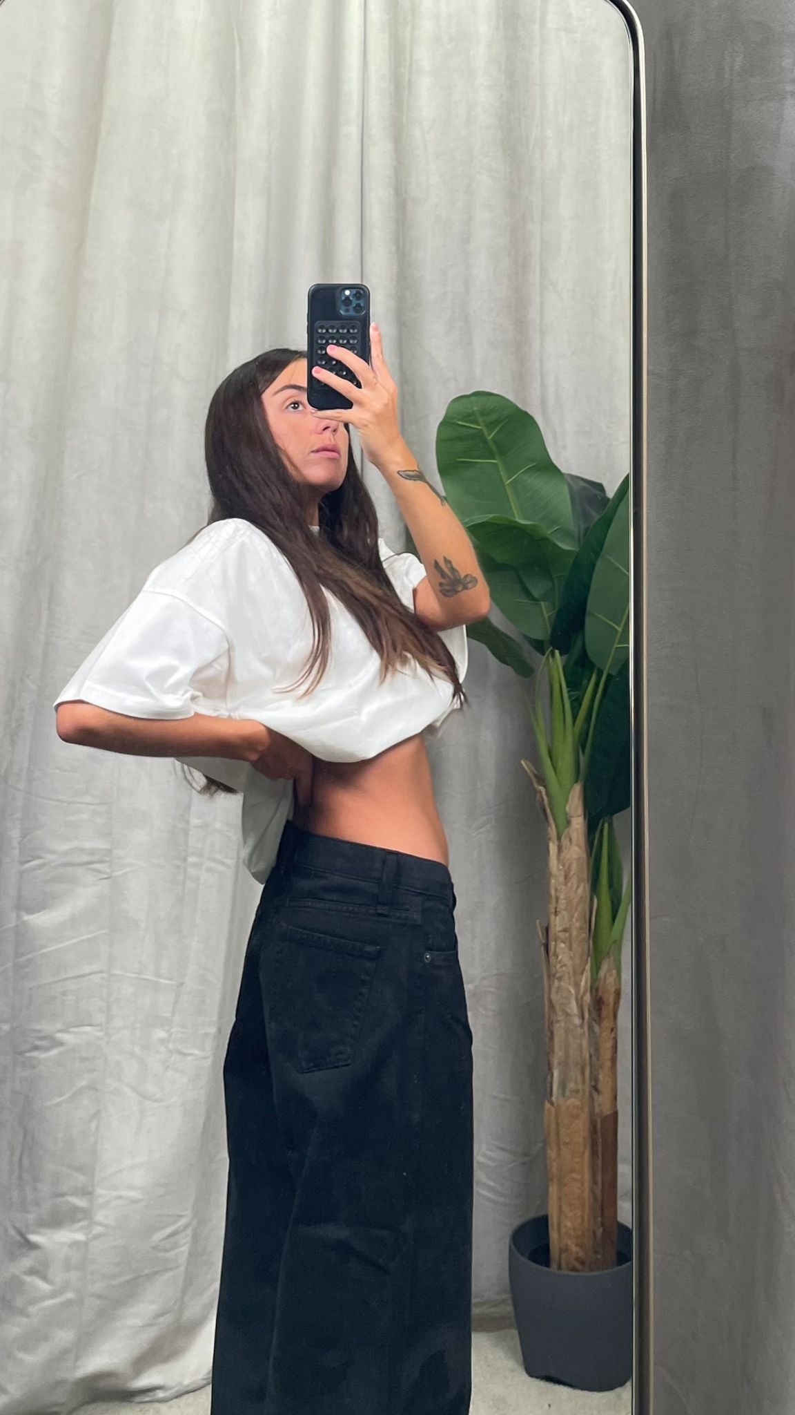 Jeans xenobia a palazzo ampio con vita bassa e passante. Gamba lunga. Con tasche anteriori e posteriori. Chiusura frontale con cerniera e bottone. Dettaglio denim nero con lavorazione a laser in fantasia floreale.