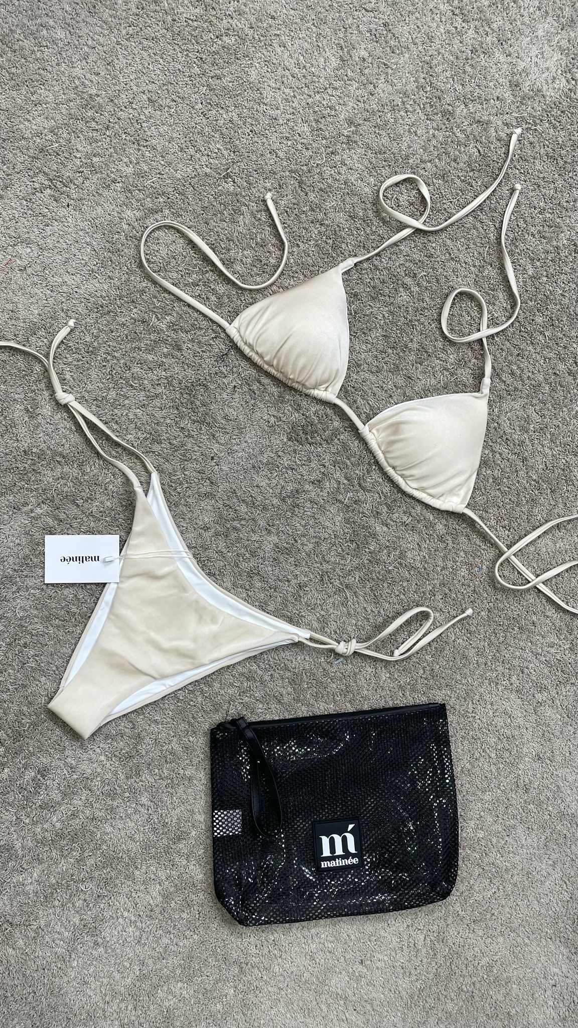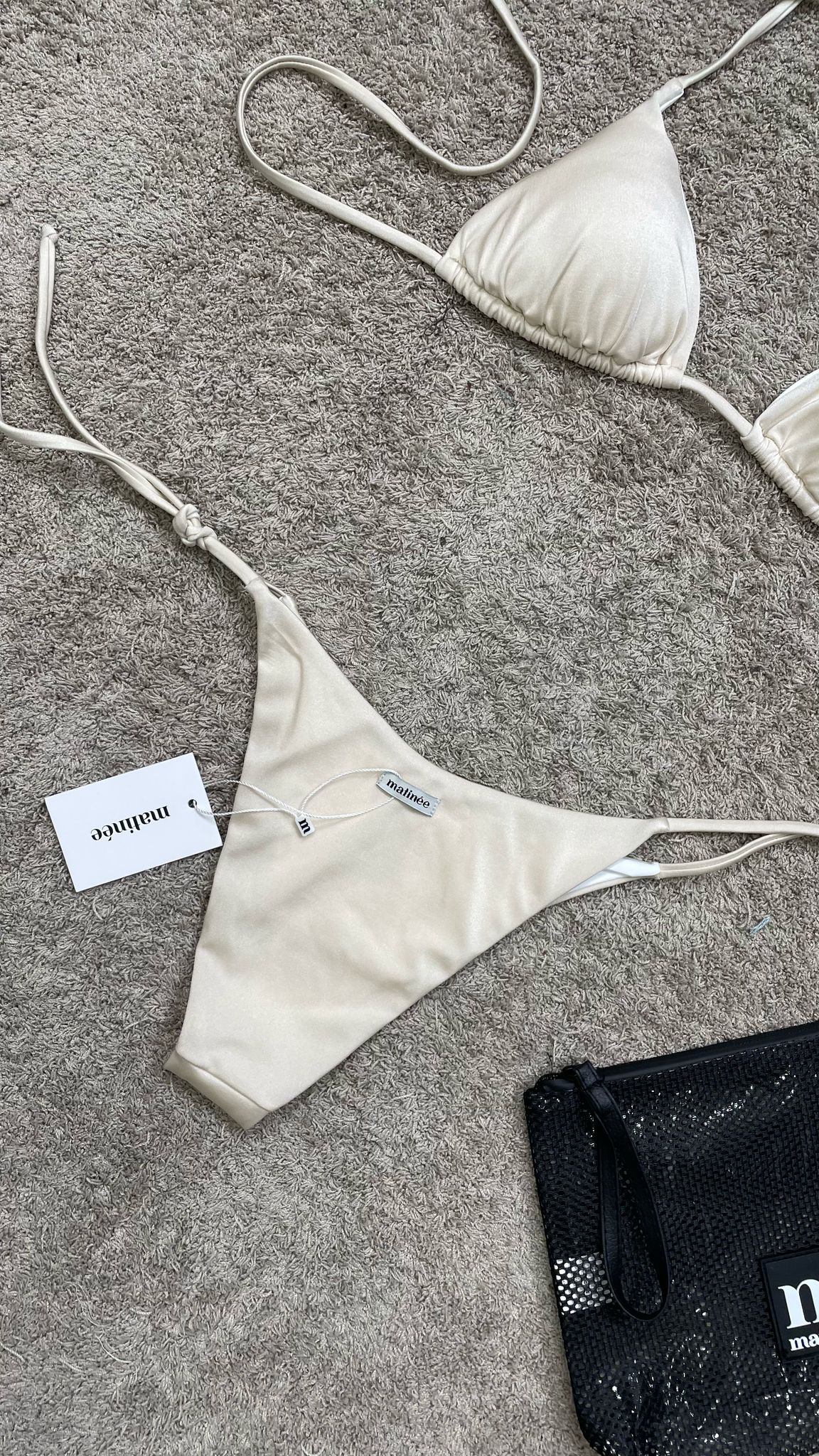 Kate è il bikini must-have dell’estate. Combina un top a triangolo con laccetti regolabili e coppe estraibili e uno slip, anch’esso con laccetti regolabili laterali e una sgambatura a brasiliana. Realizzato in lycra lucida, un materiale elastico e brillante che esalta le forme con eleganza. In tinta unita, nella colorazione bianco.