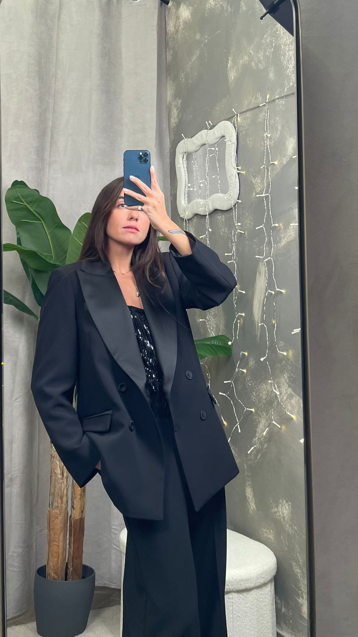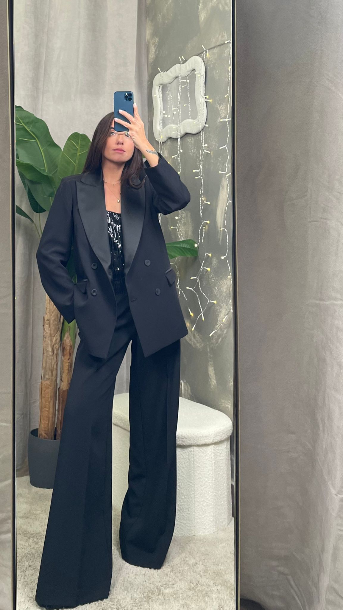 La giacca presenta revers in raso, bottoni rivestiti tono su tono e una silhouette leggermente oversize che dona un’eleganza moderna e sofisticata. I pantaloni, ampi e fluidi, completano il look con una linea slanciata e impeccabile.