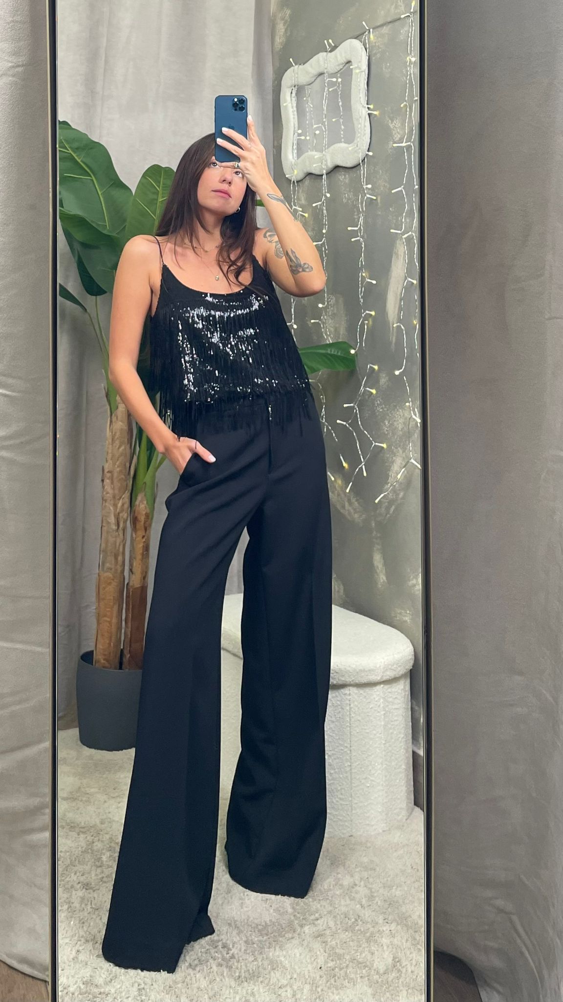 Tailleur Haveone elegante in tessuto nero luminoso, composto da giacca doppiopetto e pantaloni a gamba larga.
